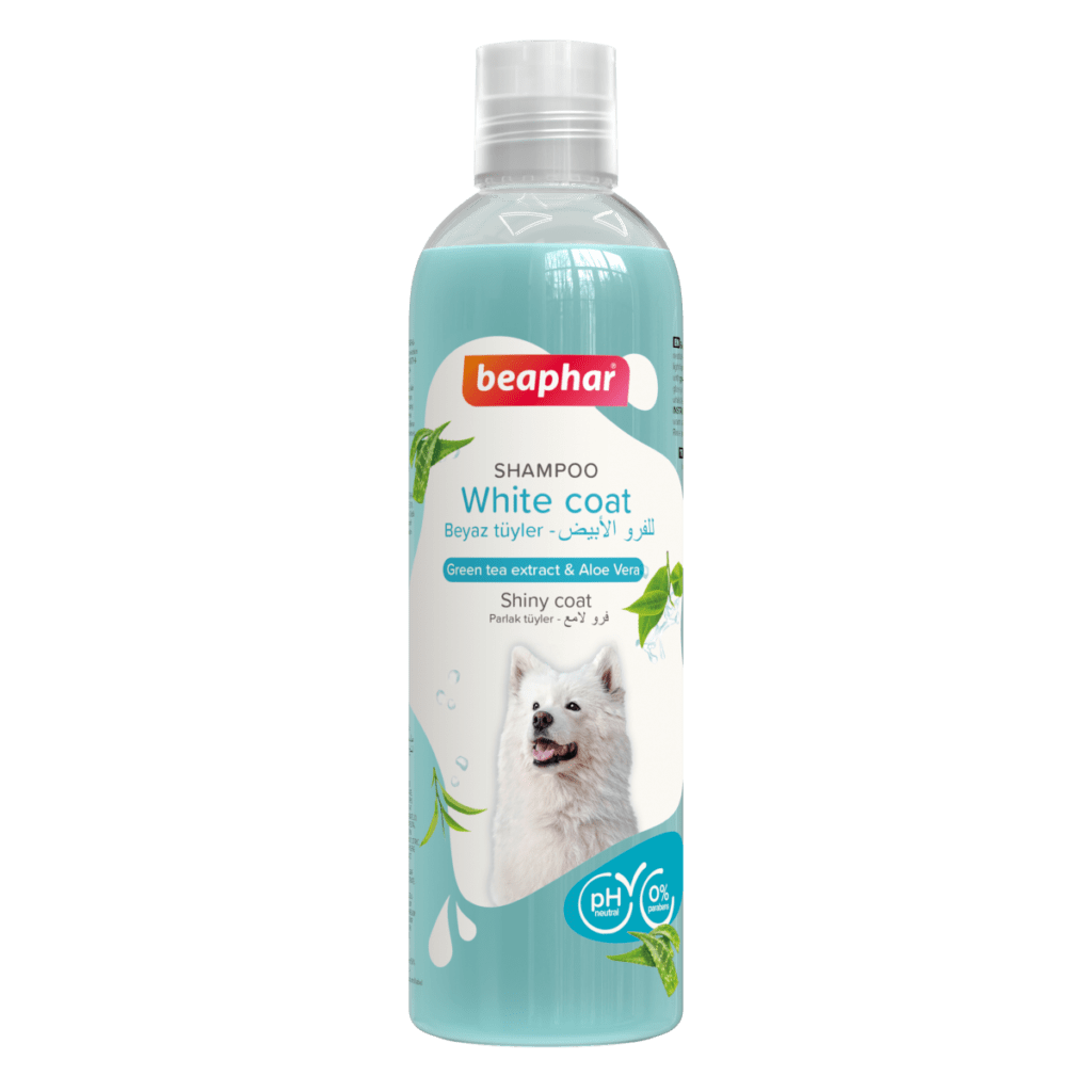 For white and light-haired dogs, Beaphar White Dog Shampoo is a mild, pH neutral, specially formulated shampoo. Enriched with green tea extract and Aloe vera, it leaves the coat glossy and soft and helps to maintain its natural white colour, whilst leaving your dog smelling fresh and clean.